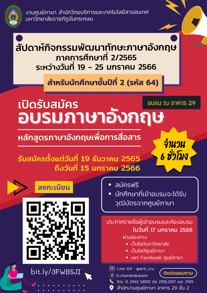 เปิดรับสมัครอบรมภาษาอังกฤษ สำหรับนักศึกษาชั้นปีที่ 2 “สัปดาห์กิจกรรมพัฒนาทักษะภาษาอังกฤษ” ภาคการศึกษาที่ 2/2565